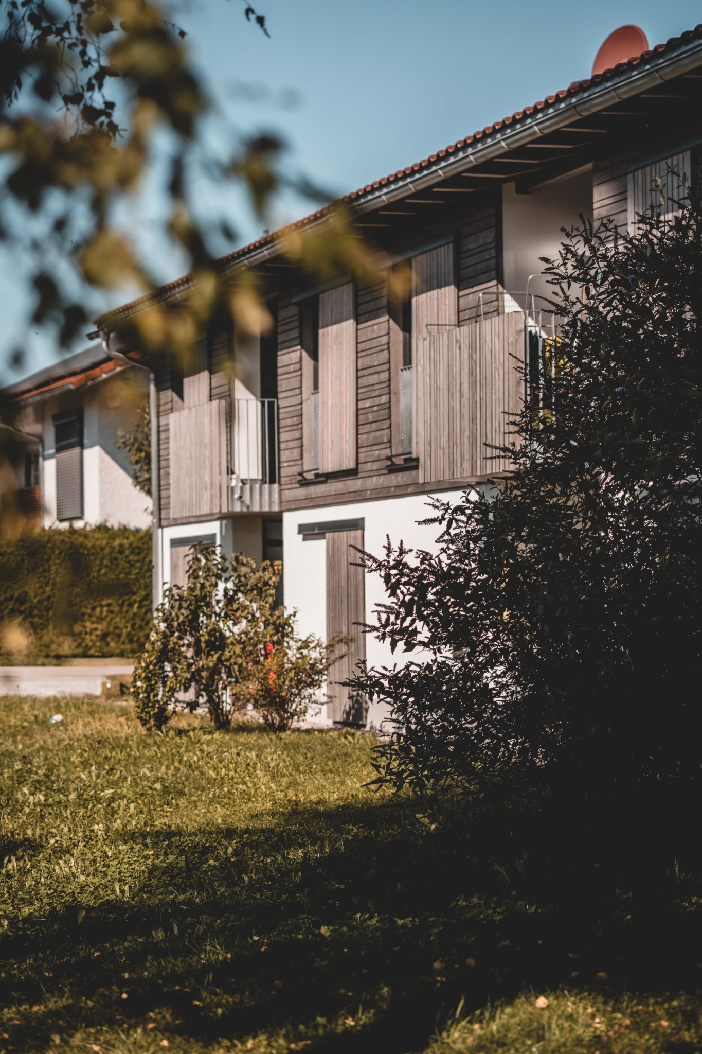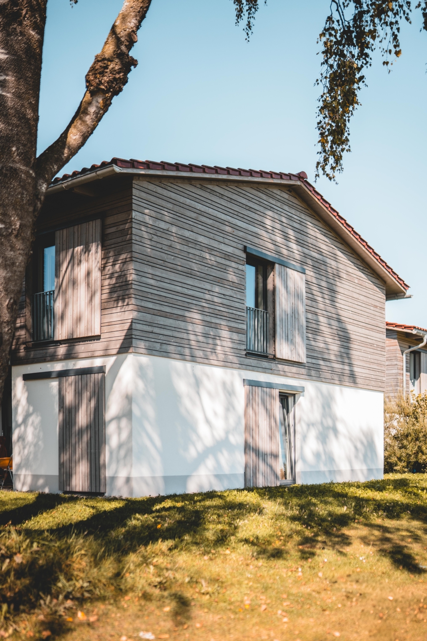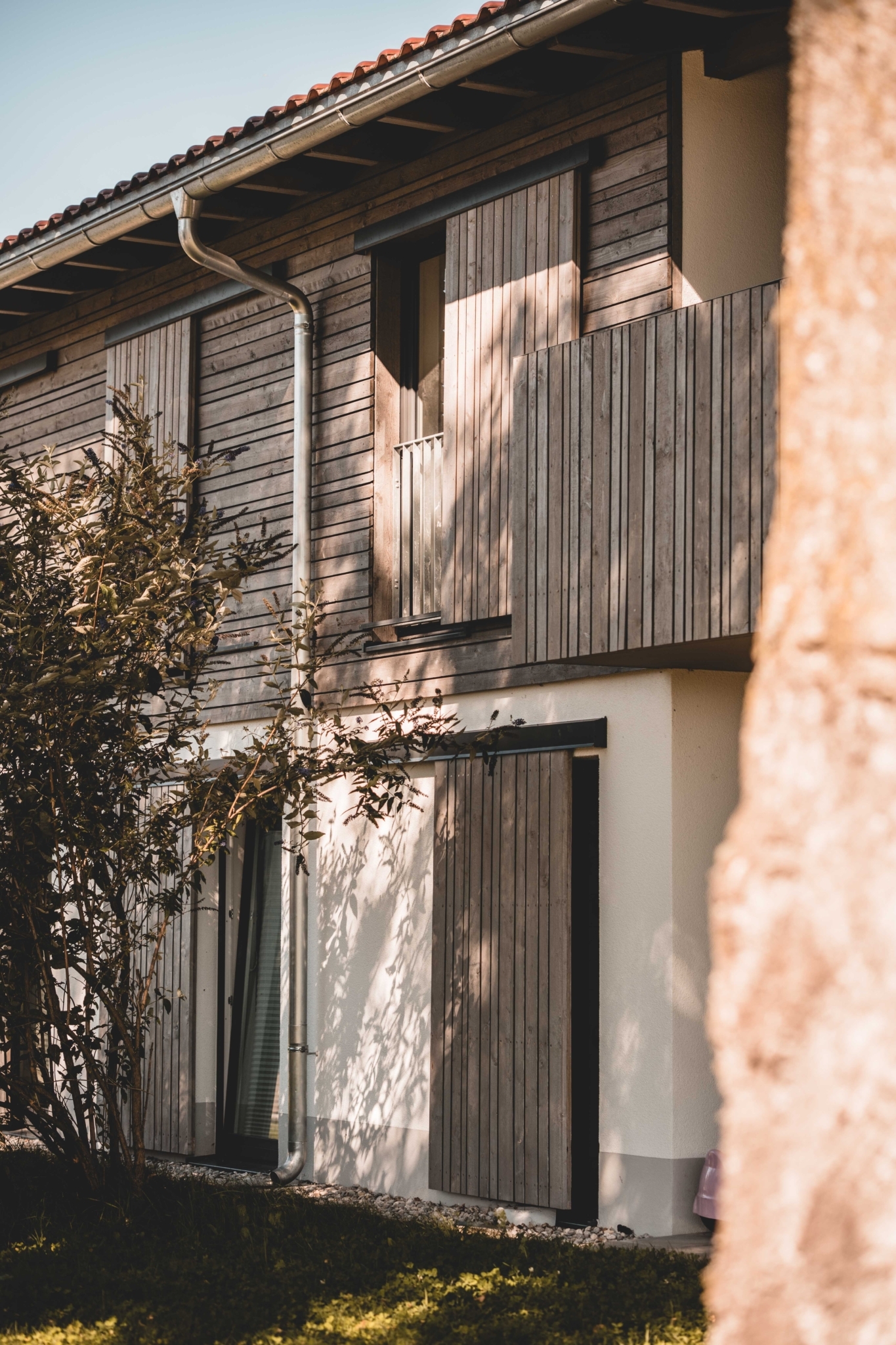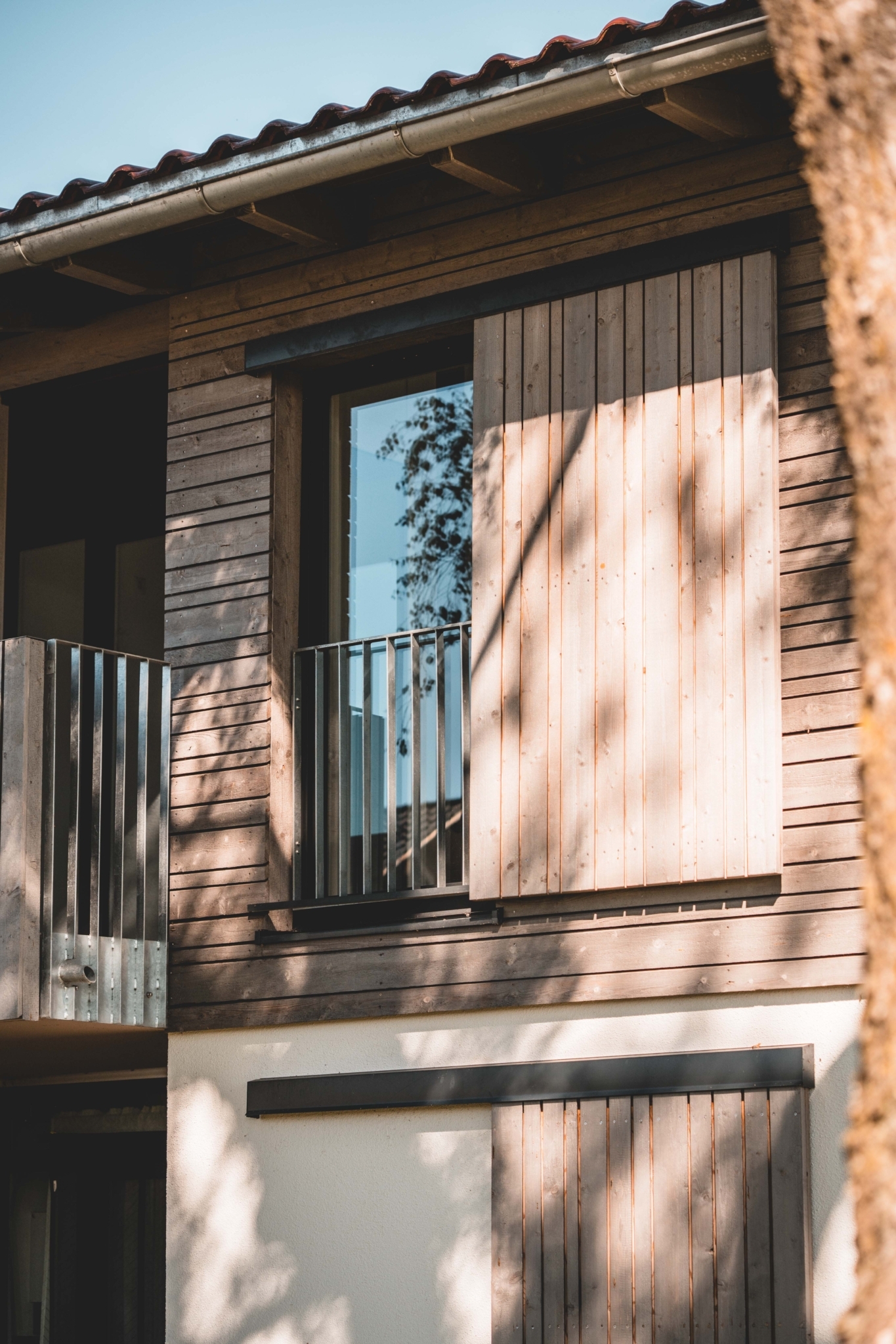 Die Fassaden im Erdgeschoss sind traditionell verputzt, die Obergeschosse sind mit einer vertikalen Holzlattung verkleidet. Die Fenster sind mit modernen Schiebeläden als Analogie zu den traditionellen Fensterläden ausgeführt.
